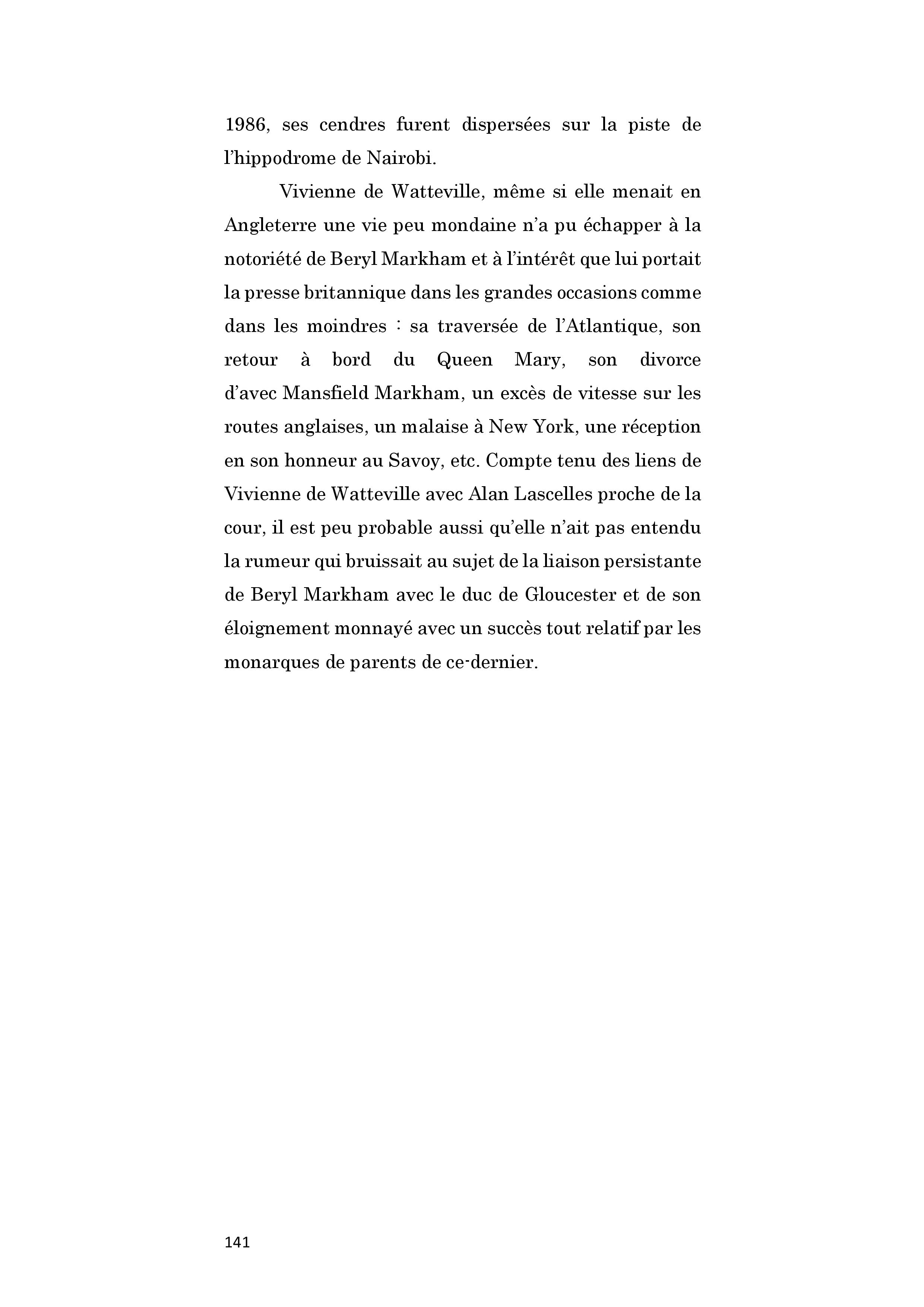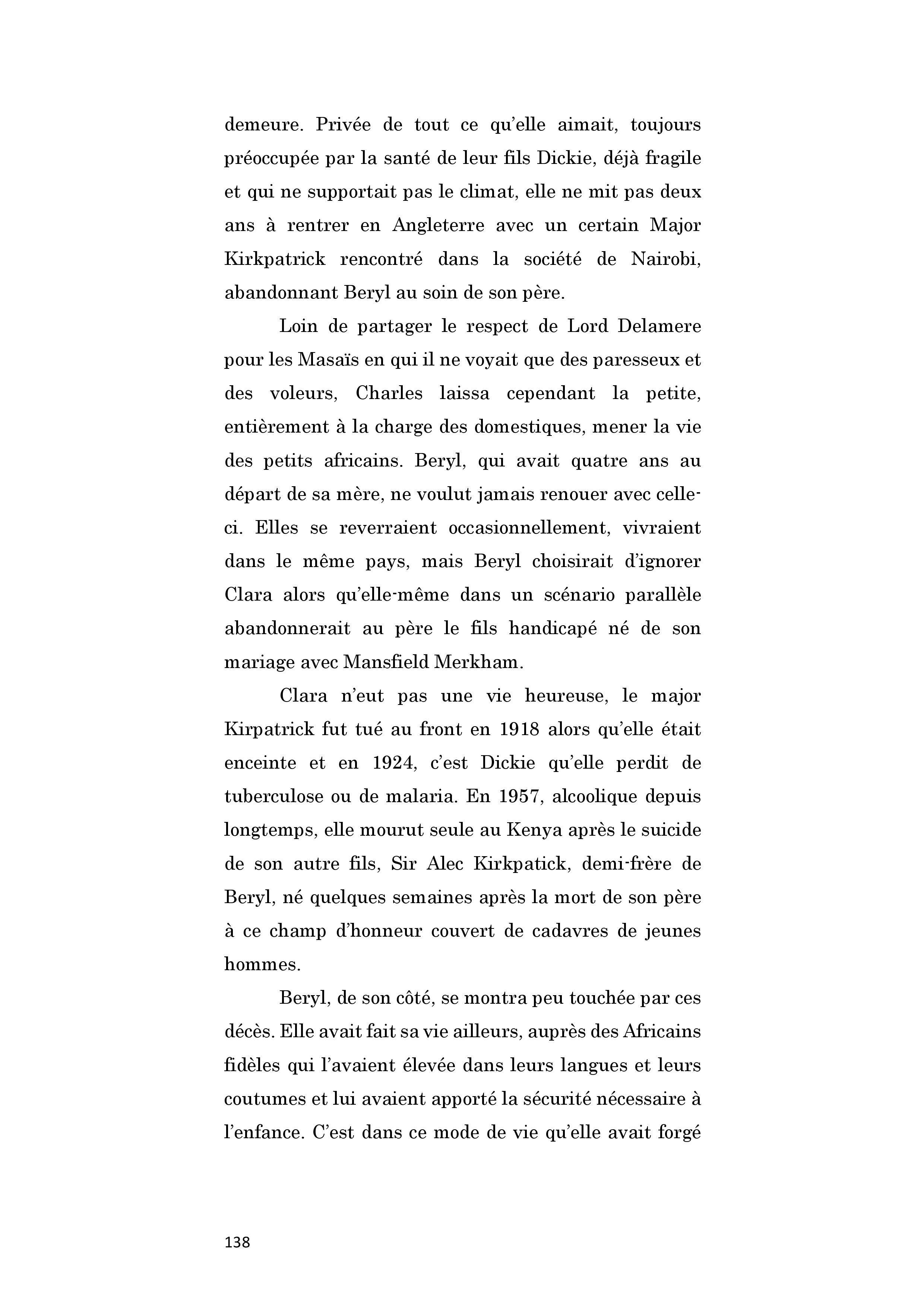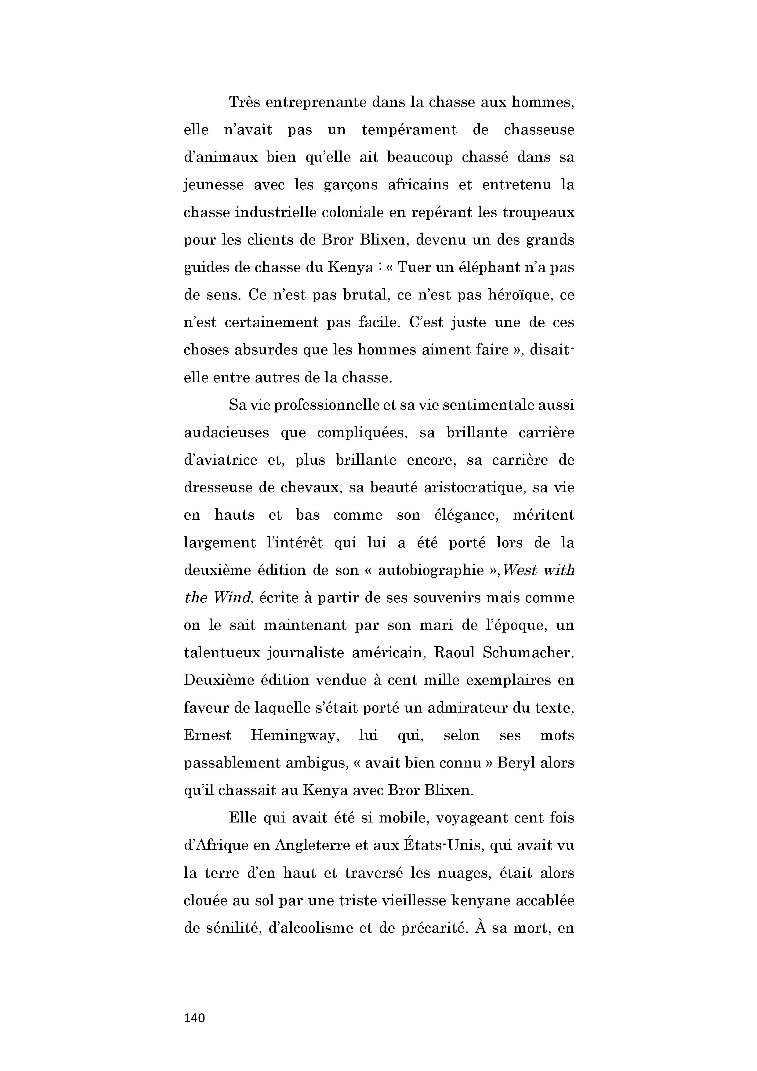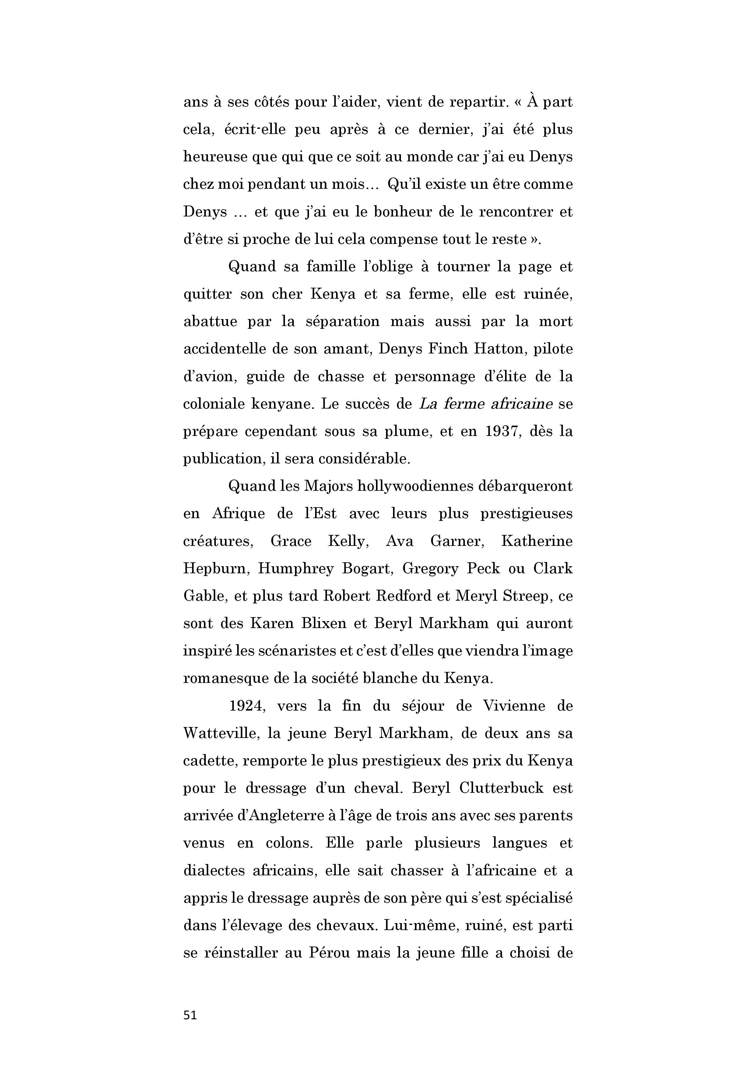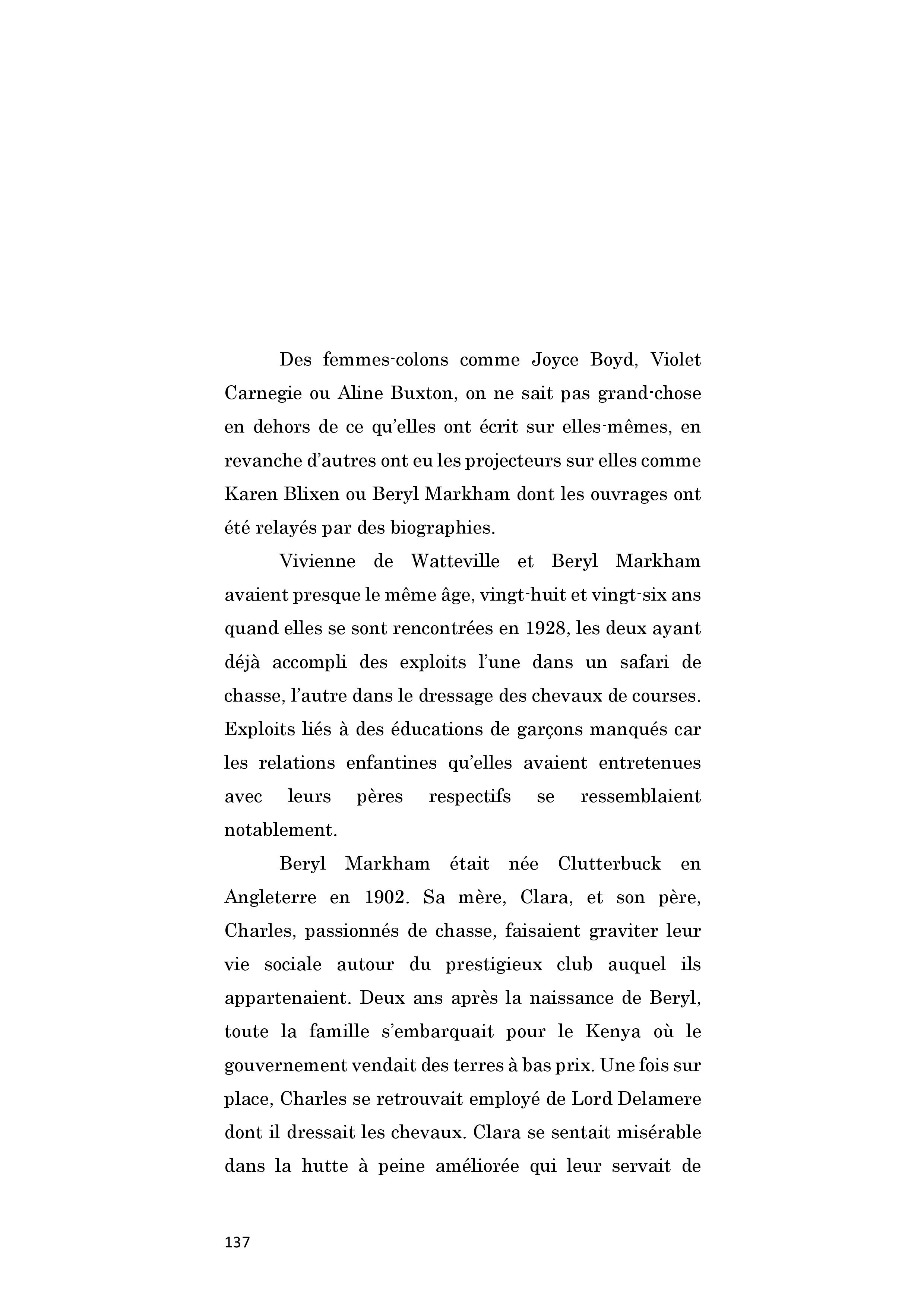 Grande aventurière, Beryl Markham, est la première aviatrice à traverser l'Atlantique seule d'Est en Ouest, en 1936. Après cet exploit, elle s'installe quelques temps aux Etats-Unis. Salué par Hemingway, Vers l'Ouest avec la nuit est publié en 1942. Mais l'ouvrage, écrit en vérité par son troisième mari, ne rencontre pas son public. Elle retourne au Kenya en 1952 et au milieu de l'équitation, sans grand succès financier, sombrant dans la misère et l'alcool. C'est une seconde édition de son ouvrage, au début des années 80, qui lui permet d'améliorer les conditions matérielles de sa vieillesse. Elle meurt à l'âge de 84 ans.