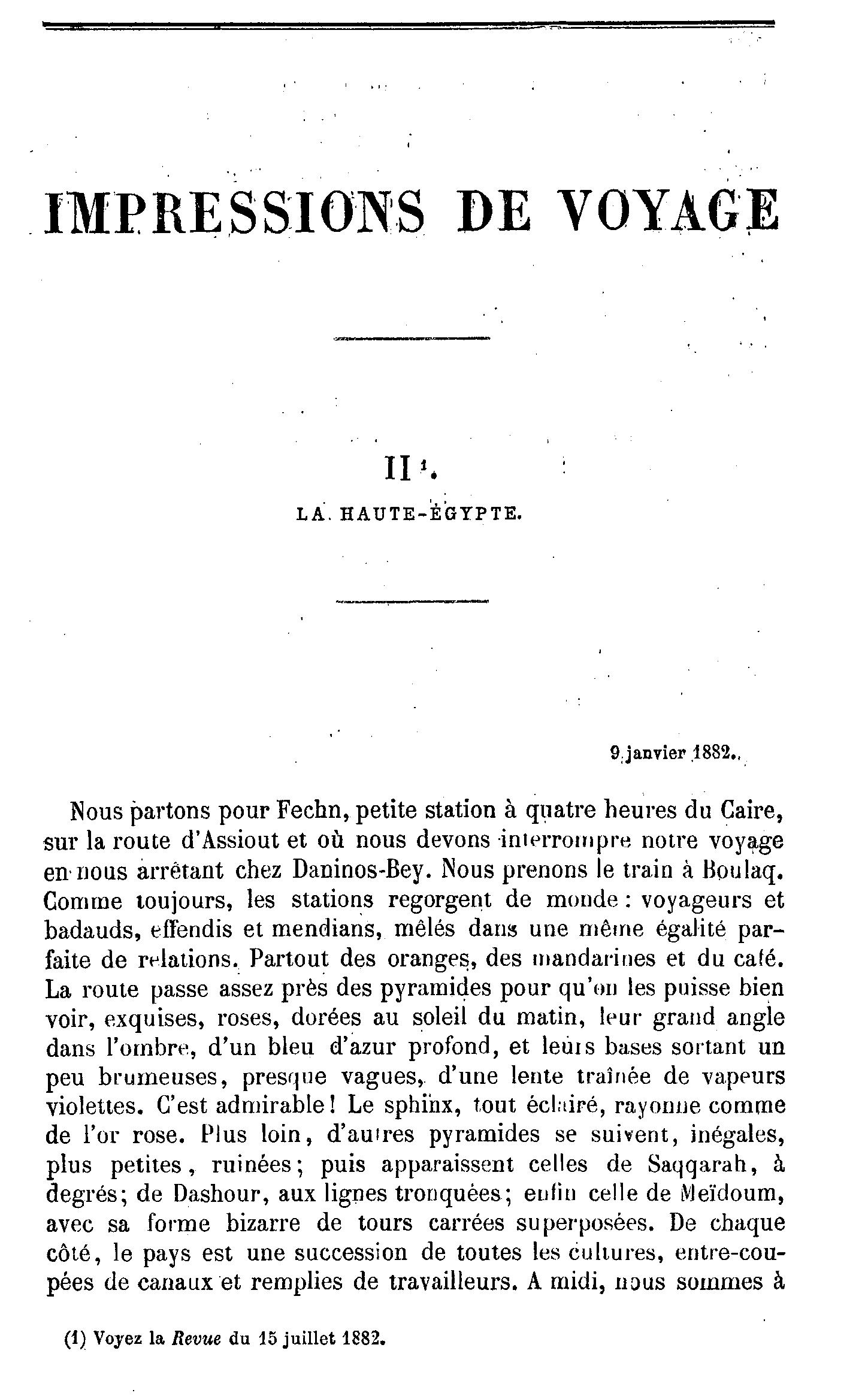 « Impressions de voyage. La Haute Egypte », Revue des Deux Mondes, 1882, T. 52, p. 875-913.