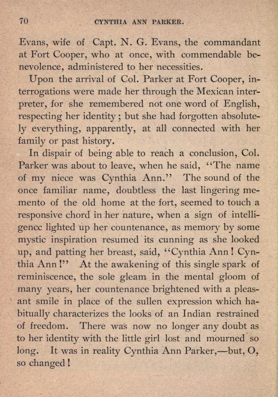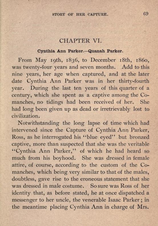 Personnage célèbre de l'histoire américaine, enlevée au Texas à 9 ans et adoptée par les Comanches, elle fut pleinement indianisée. Elle se maria et eut deux enfants avec son mari Indien, chef guerrier reconnu. Retrouvée et récupérée par sa famille blanche, elle essaya obstinément de s’enfuir et finit par se laisser mourir de faim.