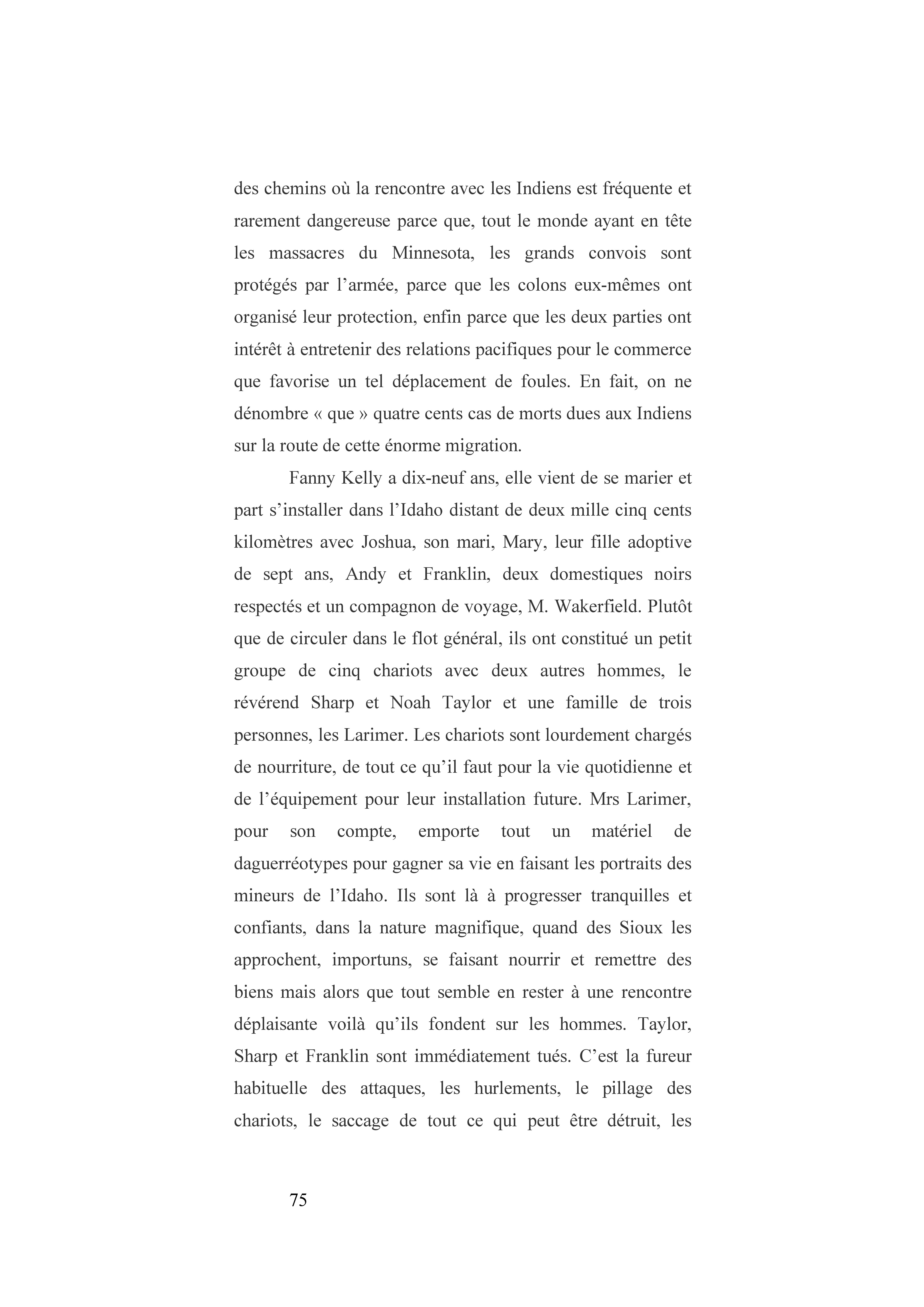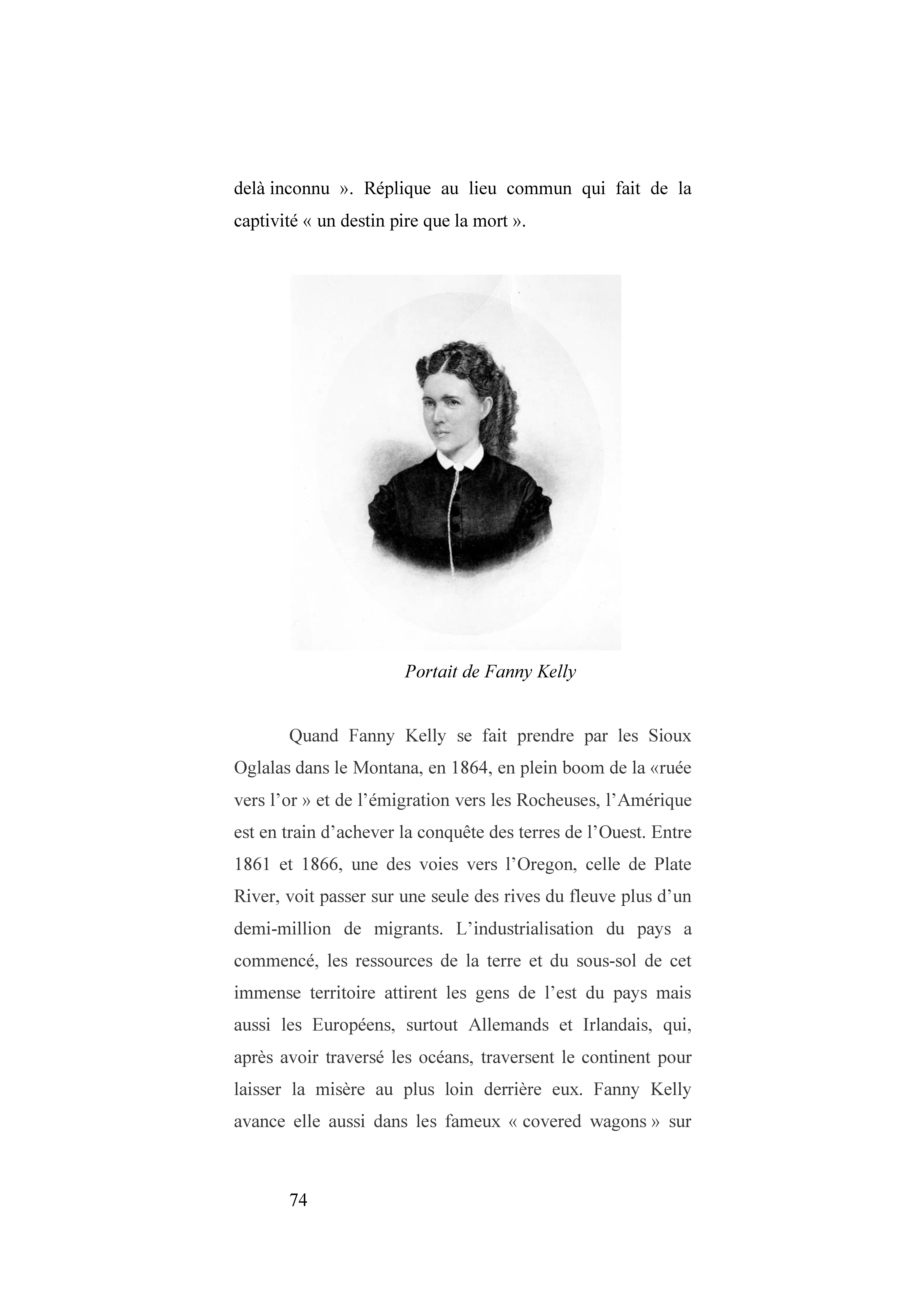 Capturée par les Sioux dans le Montana en 1864, en pleine ruée vers l’ouest alors qu’elle part s’installer dans l’Idaho avec son mari et leur fille. L'attaque est effroyables : son mari et la plupart de leurs compagnons de route sont tués. Sa fille est abattue quelques jours plus tard, en tentant de s’échapper. Fanny Kelly a écrit un remarquable ouvrage sur ce drame personnel et historique faisant une grande place à ses observations sur les mœurs des Indiens dont elle a compris le malheur corollaire.