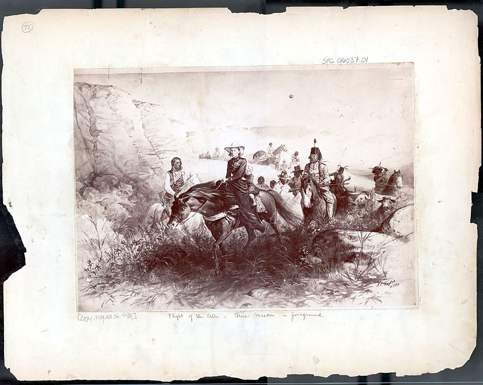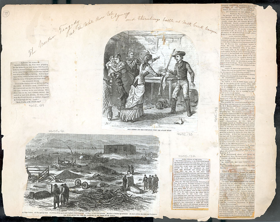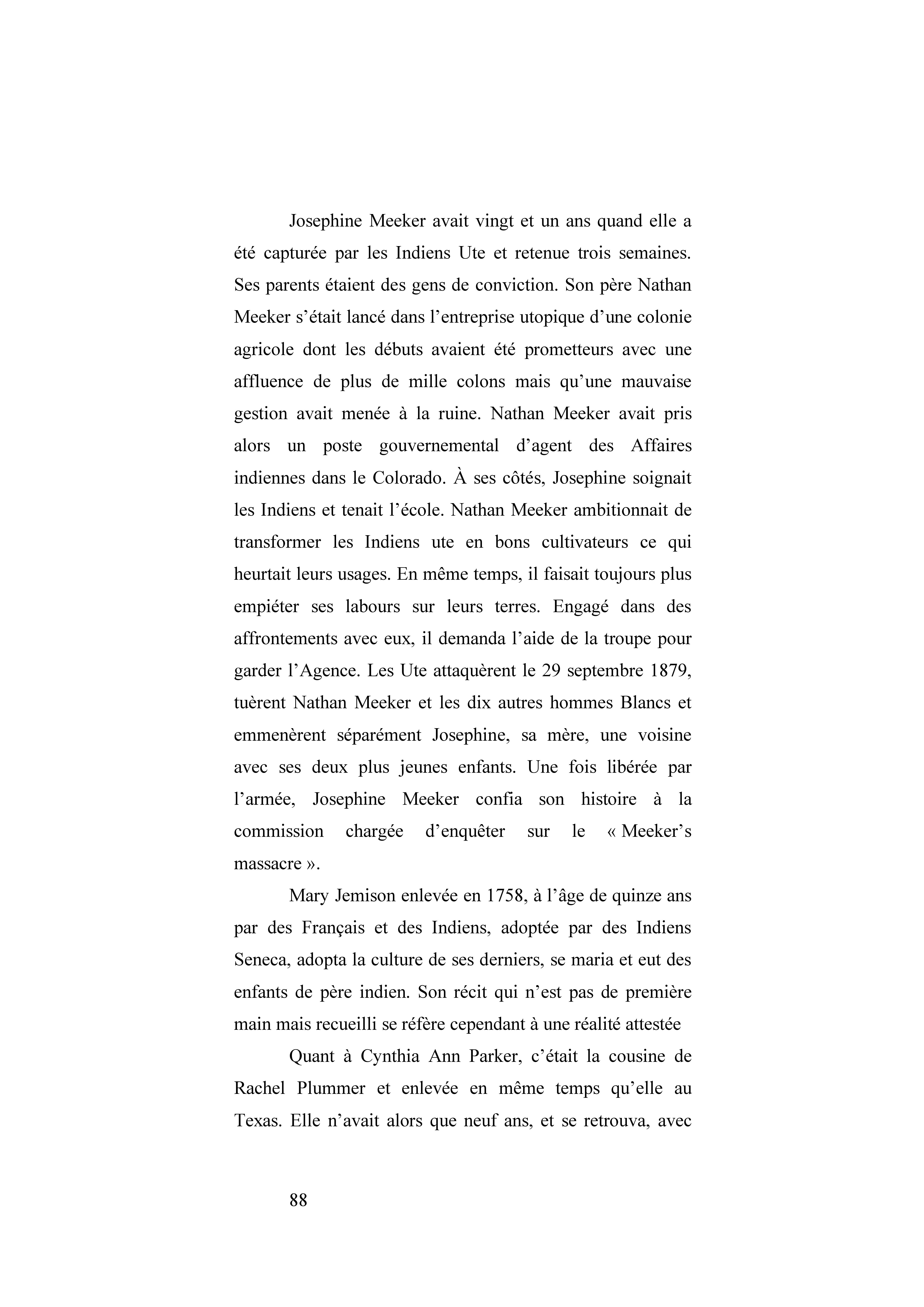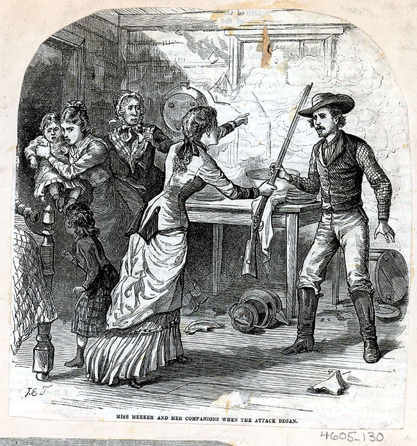 Capturé en 1879 dans le Colorado où son père occupait le poste d’Agent des Affaires indiennes du Colorado et tentait une politique d’ "américanisation » des Indiens de la région. L’affrontement a lieu en septembre 1879, alors que les colons occupent de plus en plus de terres indiennes. Tous les hommes Blancs sont massacrés, dont son père. Capturée à 21 ans elle sera délivrée par l’armée trois semaines plus tard. Pas d'autobiographie.