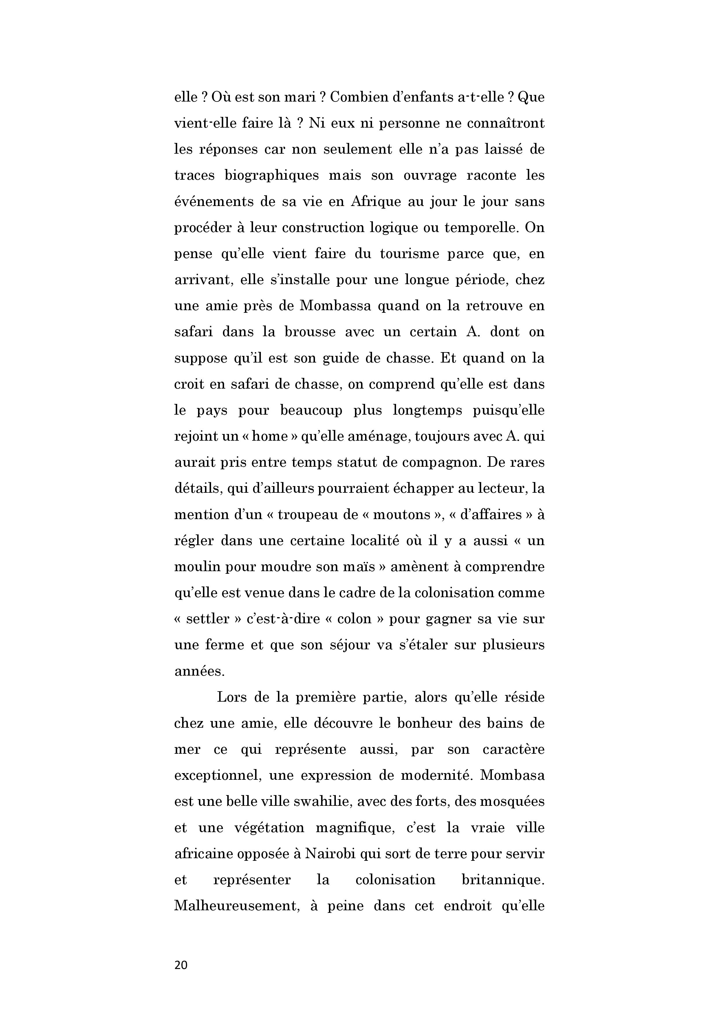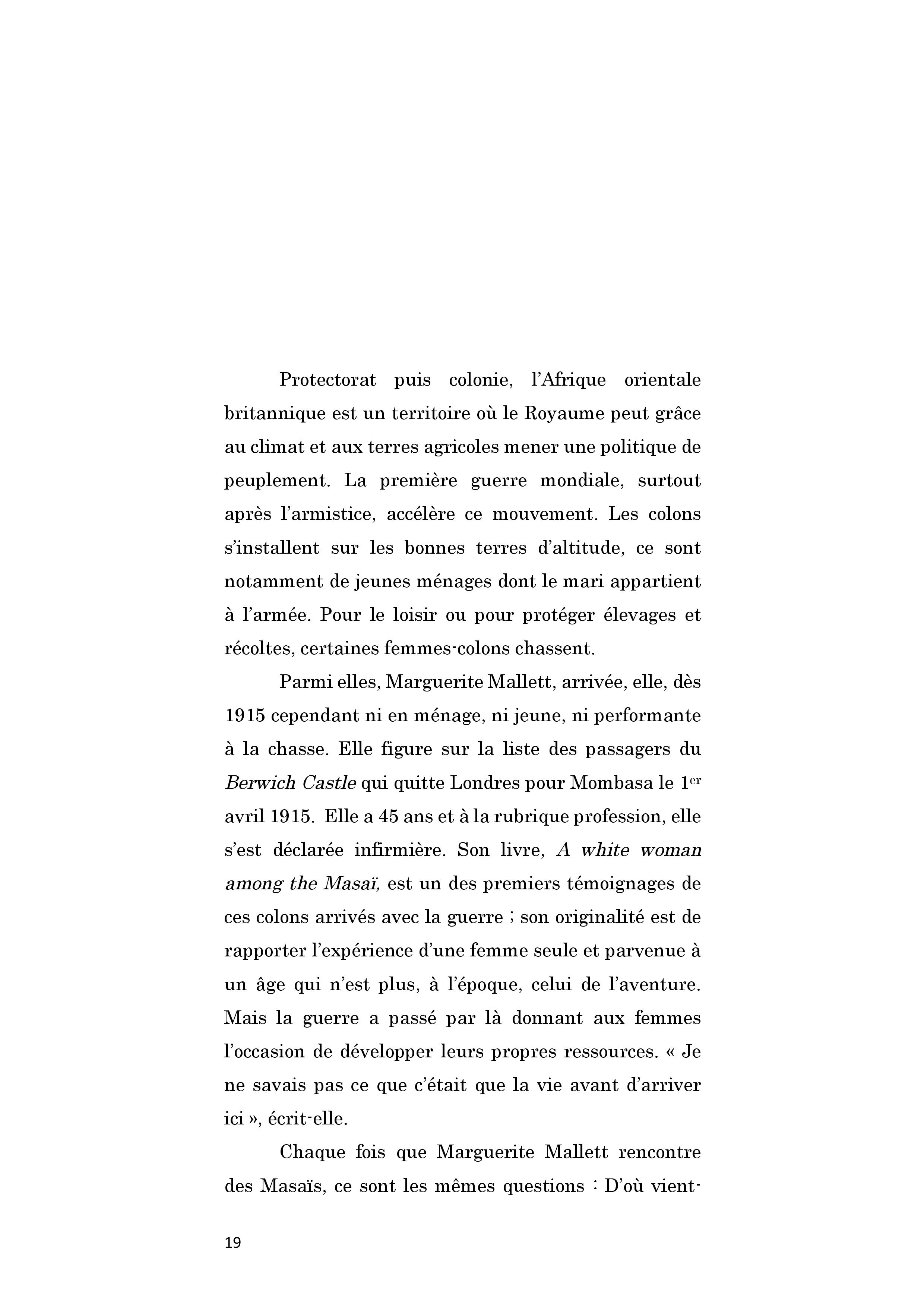 Elle débarque en Afrique de L’Est en 1915 juste à la fin de la première guère mondiale, âgée de 45 ans, infirmière jusque là et célibataire. Elle voyage d'abord puis s’installe, semble-t-il car son récit est sur ce point très elliptique, comme colon en pays Masaï. Elle chasse mais se montre peu douée. Très attachée à ses animaux domestiques, elle essaie elle-aussi de repenser, dans ce contexte, sa relation aux animaux ce qui l'amène sauver chaque fois qu'elle le peut des bébés animaux de la brousse laissés sans défense. Son séjour en Afrique est difficile, la malaria la terrasse et sa ferme est brûlée dans une insurrection. Elle aussi, développe dans son livre des observations sur les mœurs de Masaï, mais surtout sur une ethnie beaucoup moins connue, les Nandis.