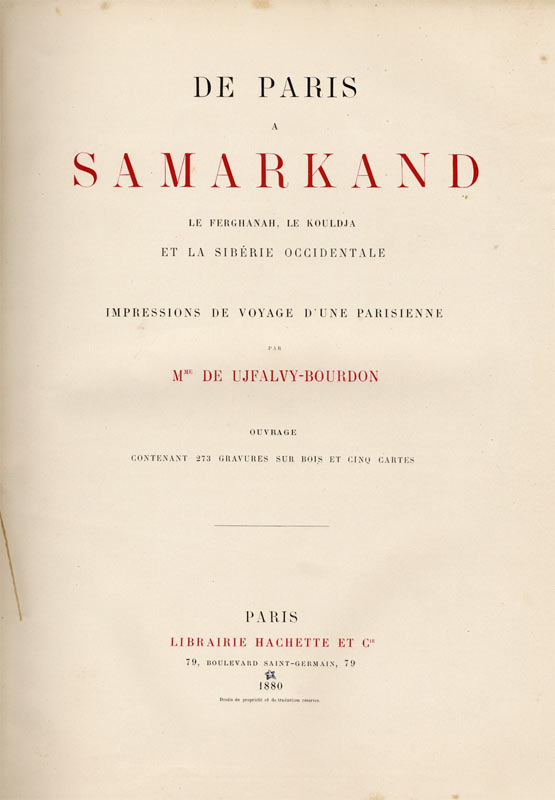 De Paris à Samarkand. Le Ferghanah, le Kouldja et la Sibérie occidentale. Impressions de voyage d’une Parisienne, Paris, Hachette, 1880.
