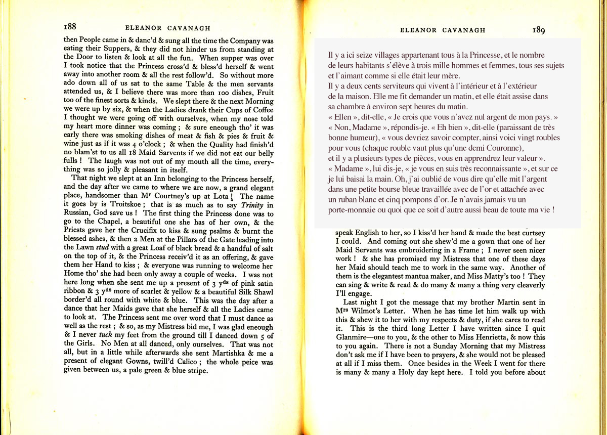 Britannique. Avec sa soeur Catherine, invitées par la princesse Dashkoff, elles font un séjour séduit et angoissé dans les grandes propriétés russes, vers 1805, avanr l'abolition du servage.