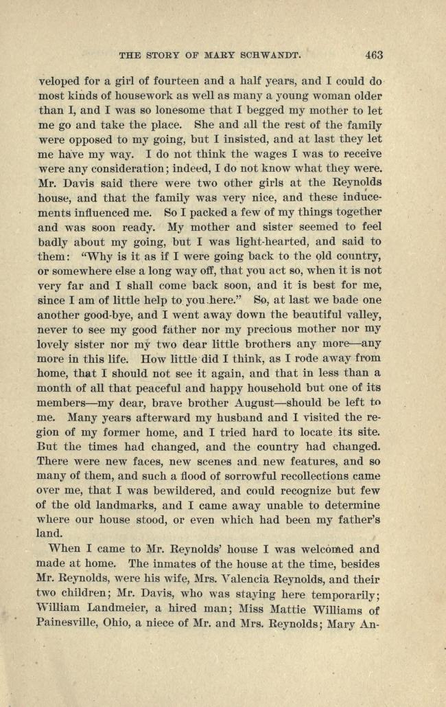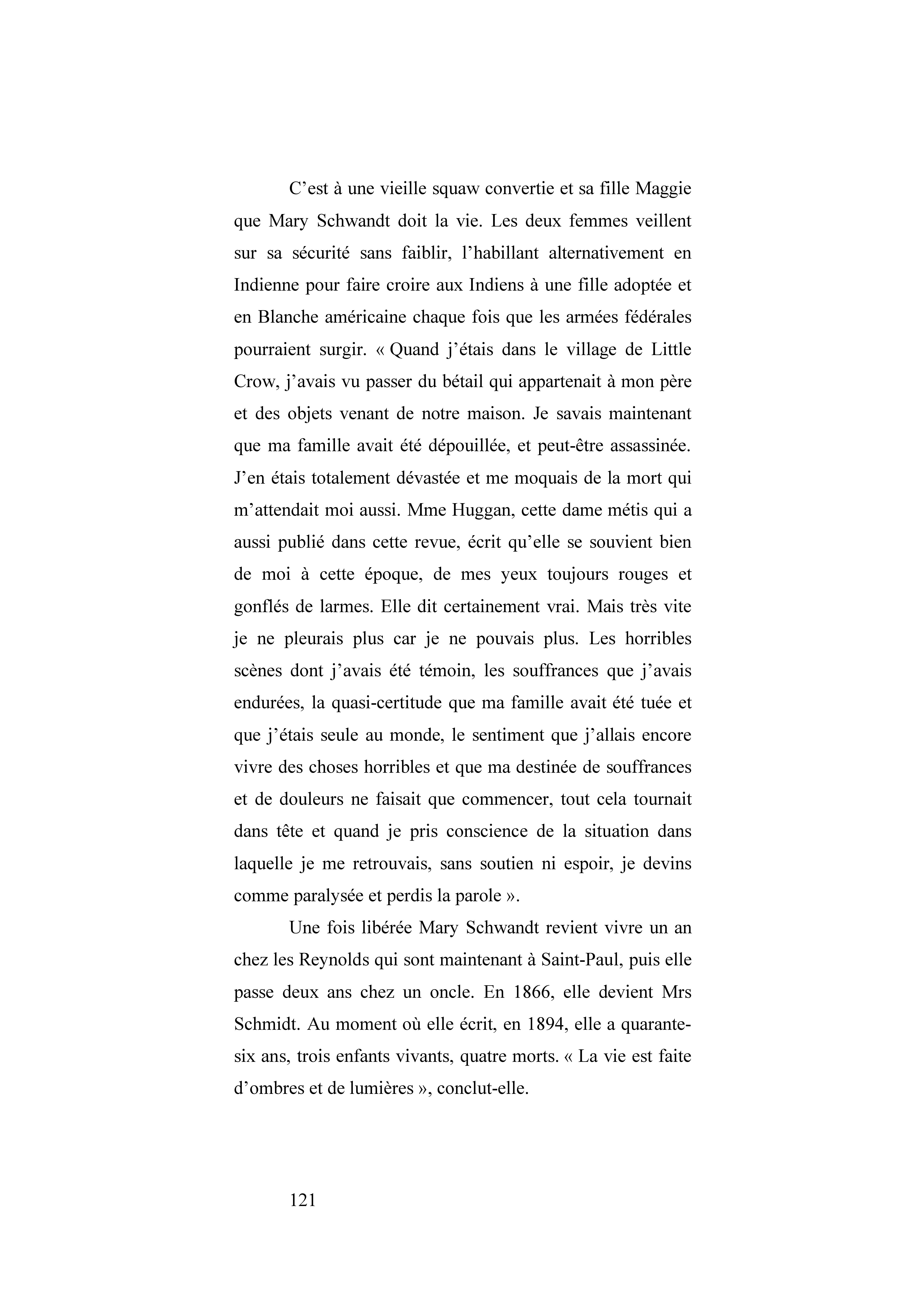 Née en Allemagne, elle s’installe avec ses parents dans le Minnesota. Elle a 16 ans quand elle décide d’aller travailler au service de voisins chez qui elle se fait capturer : c’est le début de la Guerre des Dakotas. Elle comprend au Camp indien de Little Crow où elle est internée que ses parents se sont fait dépouiller et tuer. Elle doit sa survie à l’aide d’une vielle squaw et sa fille converties. Elle publie son récit en 1894.