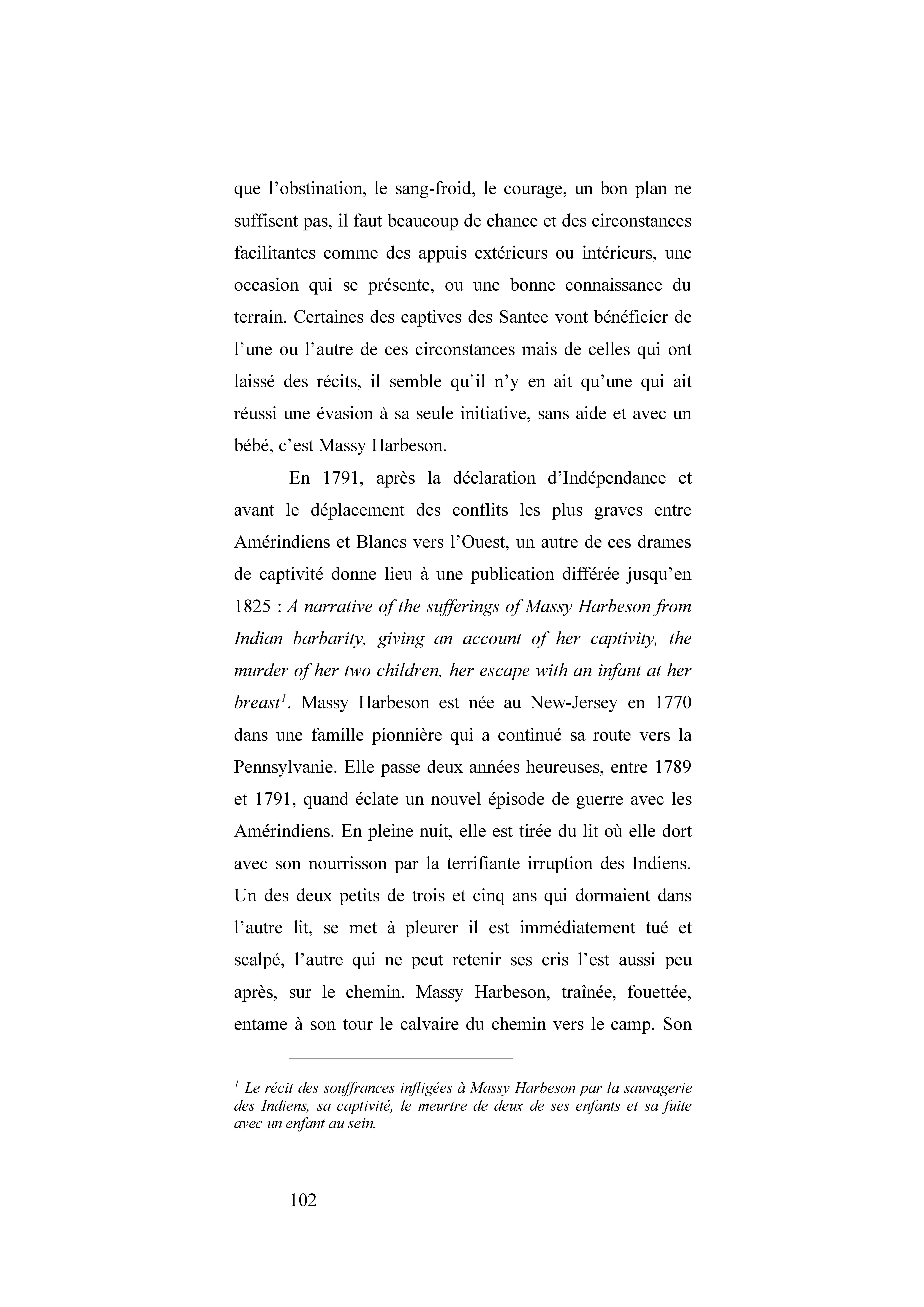 Née d’une famille pionnière aux USA, elle décide de s’installer en Pennsylvanie. En 1791, elle est réveillée en pleine nuit par une attaque d’Amérindiens. Un de ses enfants en bas âge est tué et scalpé. Elle entame un long voyage avec son nourrisson maltraité lui aussi vers un camp indien mais, une semaine après sa capture, elle arrive à s’échapper. Après une errance d’une semaine, elle est recueillie avec son bébé par un Blanc, rare ou seul cas de mère ayant réussi une évasion.