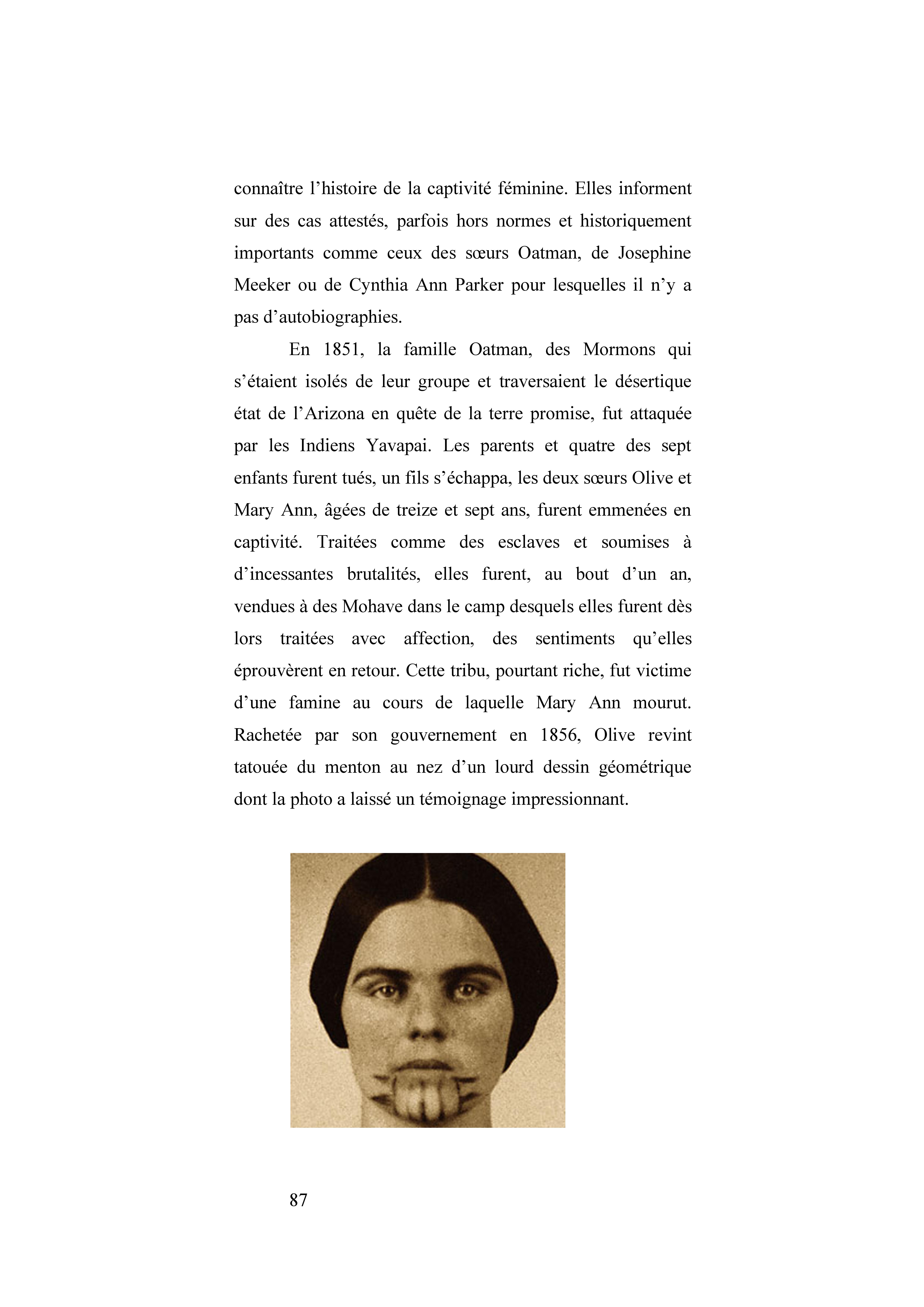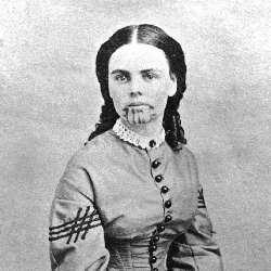 En 1851 la famille Oatman, d’obédience mormone, traverse l’Arizona en quête de la terre promise. Ils sont attaqués par les Indiens Yavapai. Les parents et quatre des sept enfants sont tués. Deux sœurs, Olive et Mary Ann, âgées de 7 et 13 ans, sont emmenées en captivité. Rendues en esclavage et malmenés, elles sont ensuite revendues à des Mohaves et bien traitées. En 1856, Olive et rachetée par son gouvernement. Elle apparaît sur les photos le bas du visage lourdement tatoué.