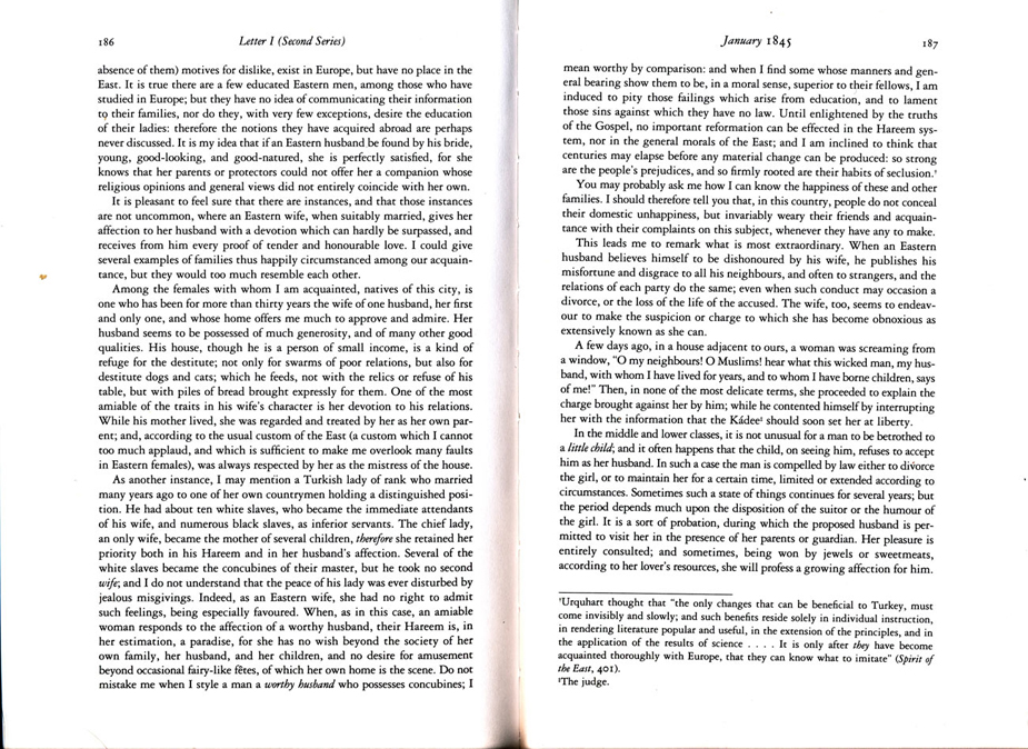 Britannique. Soeur d'un grand arabisant, épouse d'un clergyman, elle s'immerge dans la culture orientale dont elle n'ose trop désapprouver certains aspects comme le sort fait aux femmes.