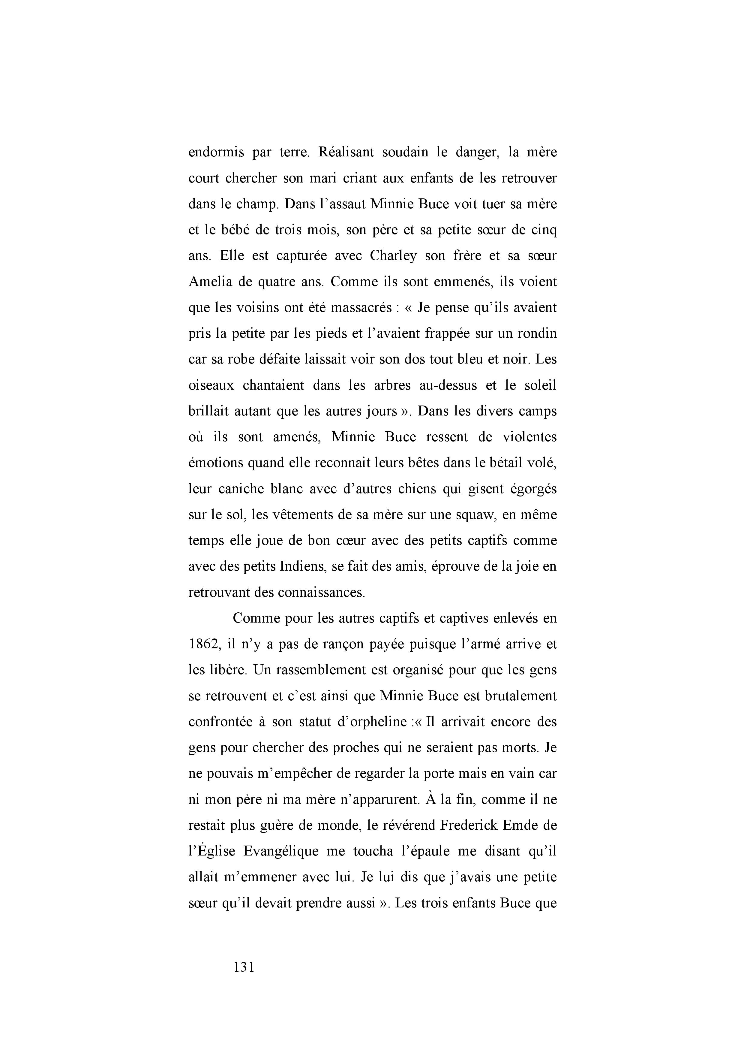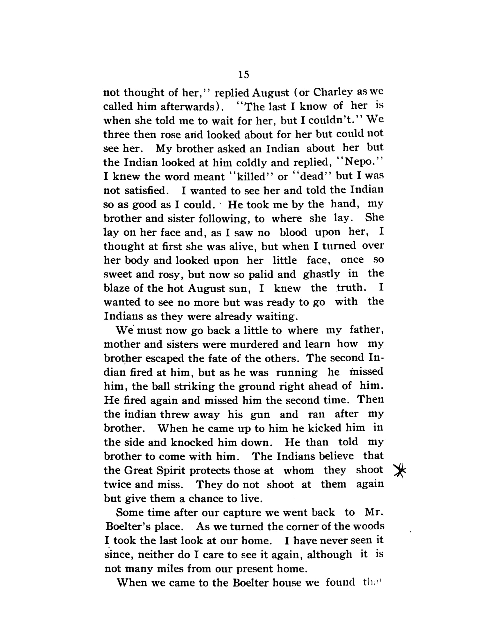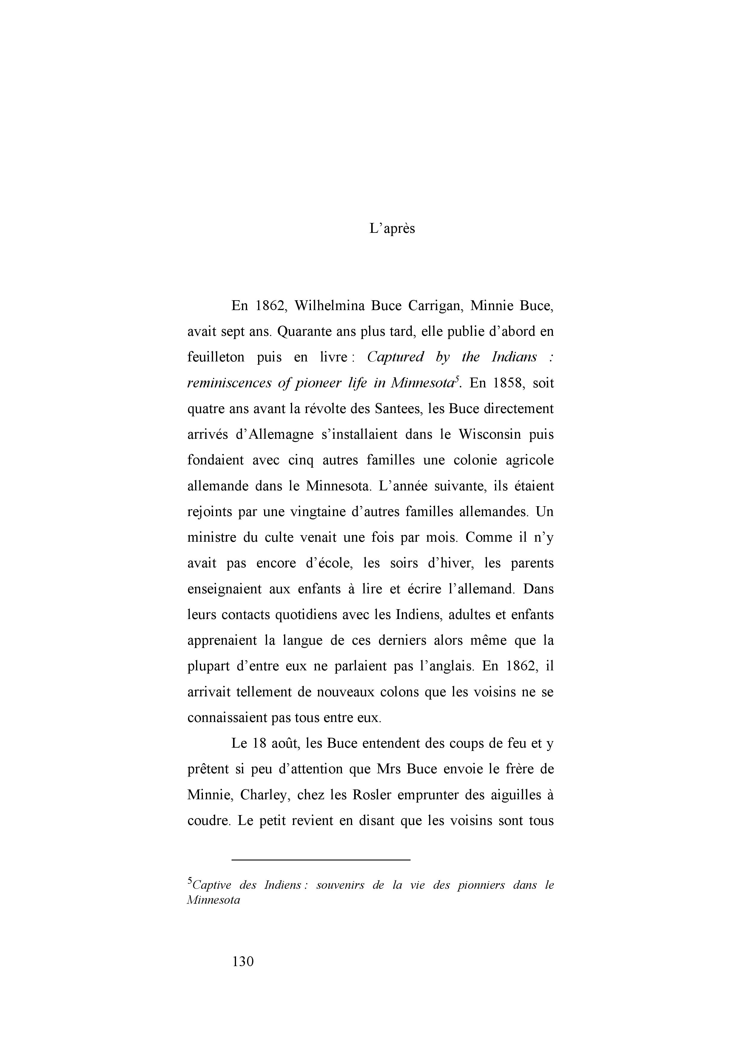 Ses parents fondent une petite communauté d’origine allemande dans le Minnesota. En 1862, alors que le nombre de colons n'a cessé de croître, les Sioux attaquent. Elle a sept ans et voit une bonne partie de sa famille assassinée. Quelques mois plus tard, l'armée libère le camp indien où elle est retenue et elle doit faire face à son statut d’orpheline. Elle est recueillie pour un temps par le prêtre de sa paroisse avec sa sœur et son frère. Ce dernier assistera à la pendaison des Indiens organisée en représailles et s’engagera dans l’armée pour les combattre. Elle publie son récit de captive 40 ans après les faits.