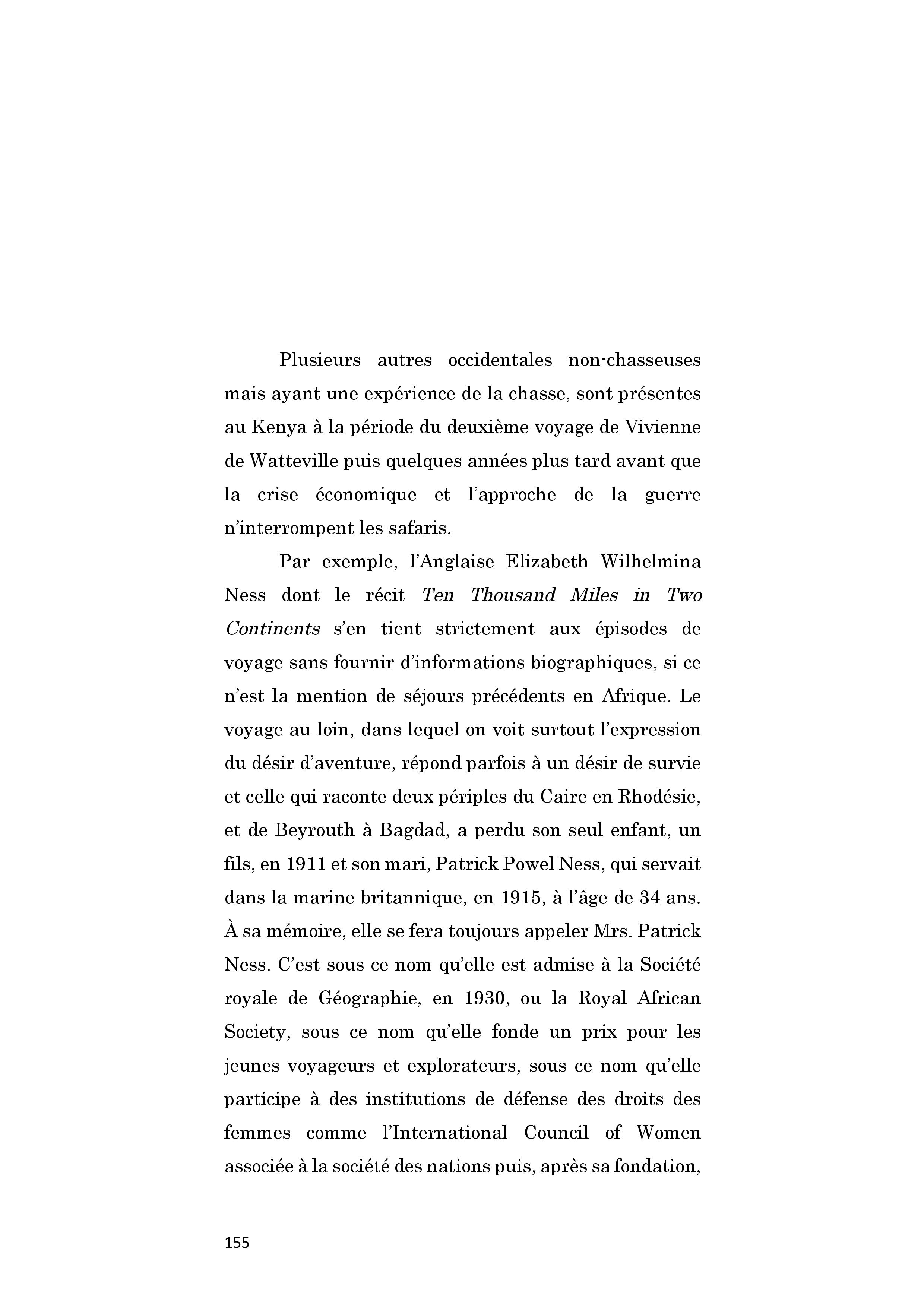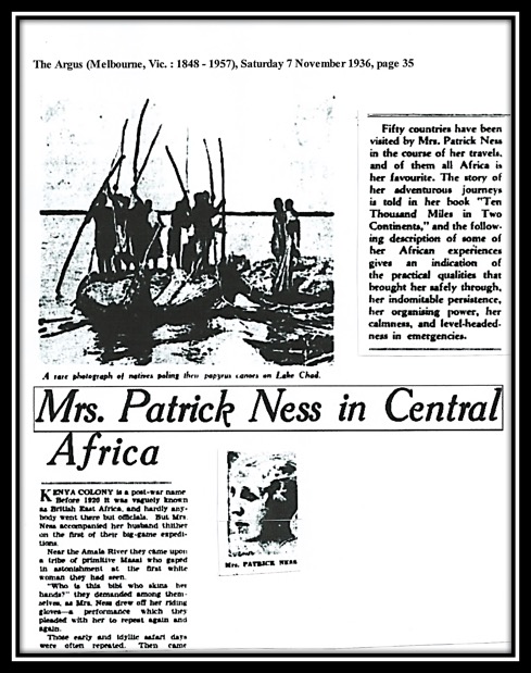 Cette Anglo-américaine fait avant la Première Guerre mondiale un premier voyage en Afrique en compagnie de son mari chasseur. Jeune veuve, elle reprendra ses expéditions en Afrique, mais ne pratiquera plus la chasse. En 1927, accompagnée d’une amie, elle voyage en Buick jusqu’en Afrique du Sud observant la modernisation de l'Afrique de l'Est. En mémoire de son mari, elle créée le prix "Ness" accordé chaque année par la Royal Geographical Society à un voyageur.
